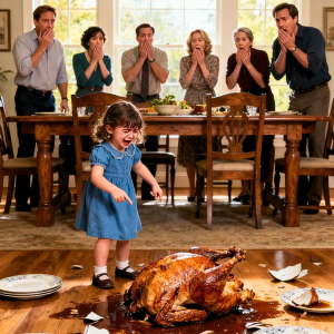 At Thanksgiving dinner, my five-year-old daughter suddenly screamed, ran to the table, and threw the entire turkey onto the floor. The whole family froze. I knelt down, trying to stay calm, and asked, “Why did you do that?” She panted, lifting her hands like she had just saved the world. “Because I saved everyone!”