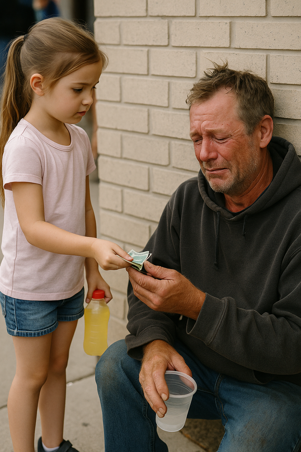 I was just trying to stretch another tight week when my daughter noticed a man crying outside the store. What happened after she handed him her lemonade—and her...