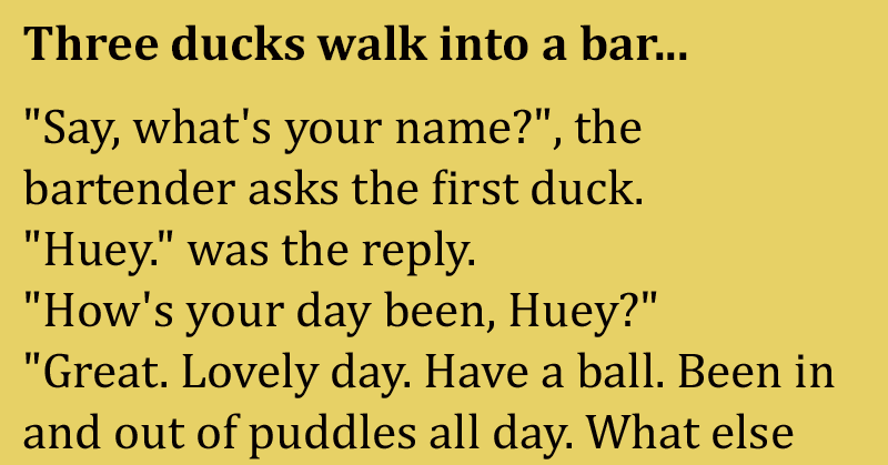 Three ducks walk into a bar… “Say, what’s your name?”, the bartender asks the first duck. “Huey.” was the reply. “How’s your day been, Huey?” “Great. Lovely day....